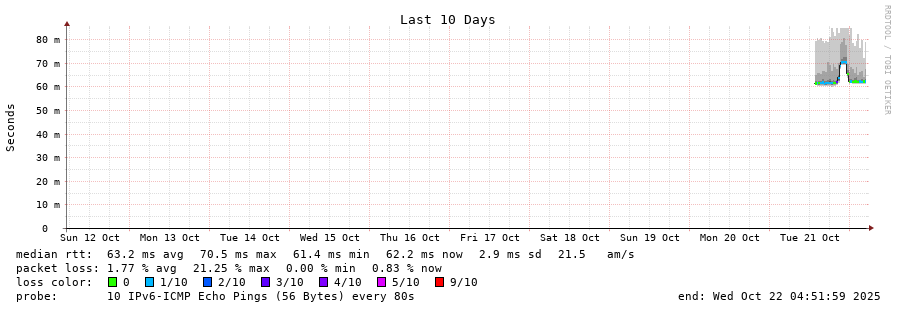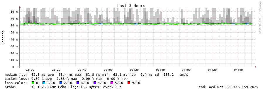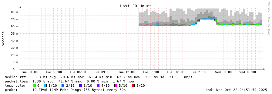traceroute to 2001:470:1f13:814:1ad6:c7ff:fe2a:502 (2001:470:1f13:814:1ad6:c7ff:fe2a:502), 30 hops max, 80 byte packets - Generated at 2025-10-22 04:45:01